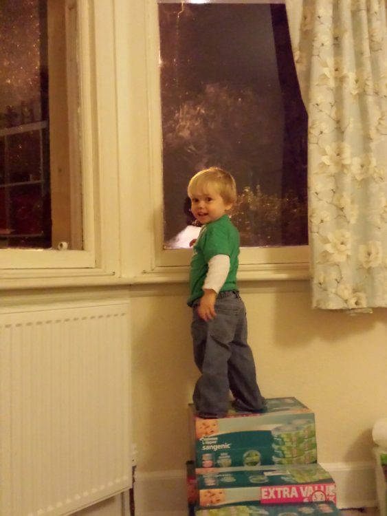 He had a very busy afternoon carrying some boxes into his play room so he could build a ladder to the window. The reason, so he could be waiting for when daddy arrived home in his car. Our normal routine is that I would hold him by the window, but only when S2 was in the street and driveway. However, with the new ladder he could watch out whenever he wanted and for as long as he wanted!