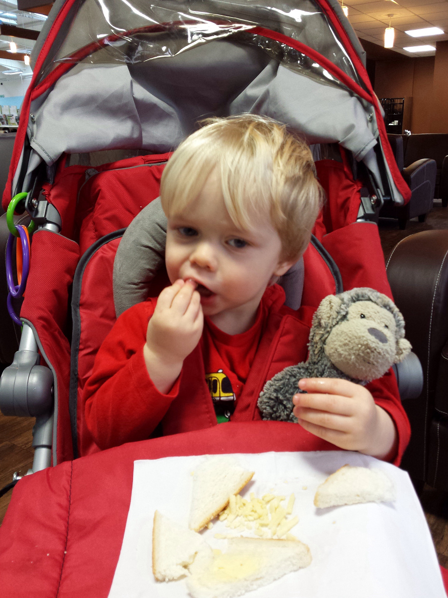 Today we had a little bit of success – he didn’t throw the bread on the floor! And he did love the grated cheese from my jacket potato – but not in the bread.