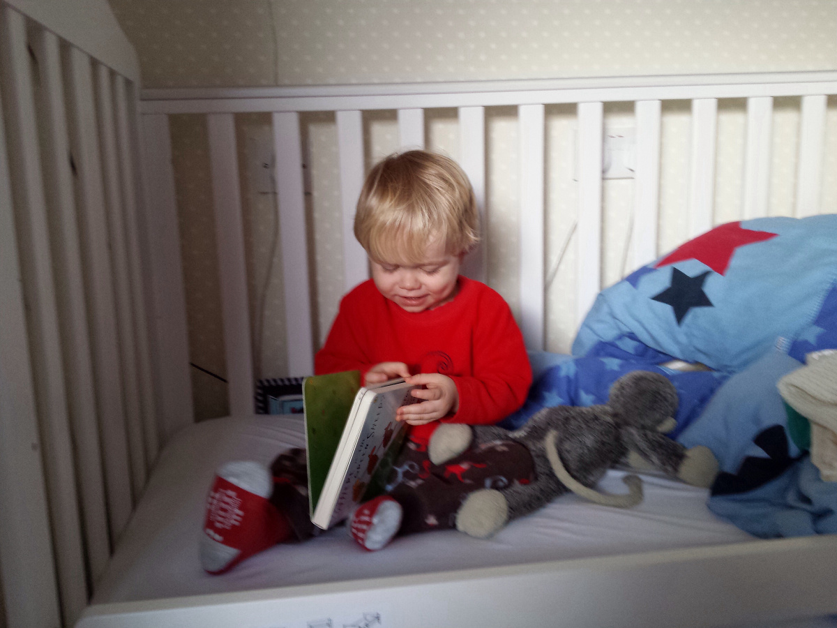 There had been no noise from him, so I assumed he was still sleeping. No – he wasn’t asleep. He had gotten his book from beside his bed and was busy reading it, waiting for me to go in and get him.