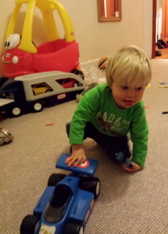 Then it was back home for some more playtime. While he was playing I tried to tidy up some of his toys, but for every box I packed away he would empty two more! That was until he worked out that with a bit more clear space he could zoom all his cars around before lining them up in one giant line.