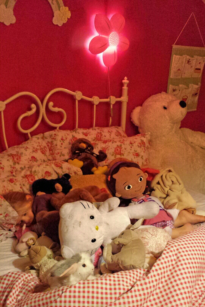 I is great at going to bed at night, although you will see here she does have her friends to keep her company.