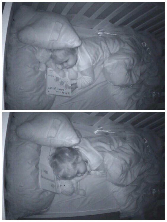 I heard a rustle on the baby monitor, then a thud, then a lot more rustling.