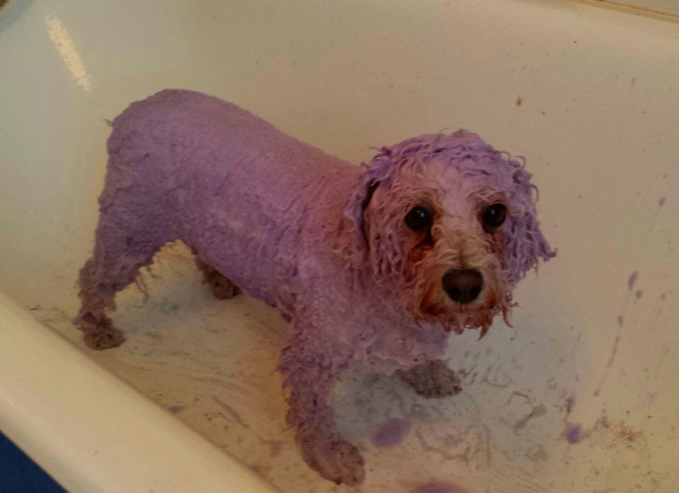 This resulted in a white dog turning a brown/grey colour, which meant a bath was required.