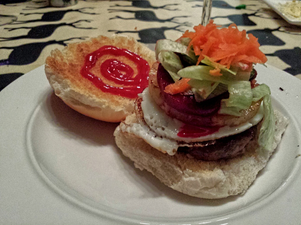 In Kiwi BBQ tradition a burger isn't complete without a Medium Rare Beef Burger, Cheese, Fried Egg, Grilled Pineapple, Beetroot Slices, Grated Carrot, Lettuce, Tomato Sauce, Salad Cream, and tonight cucumber as well, served on a buttered toasted bun.