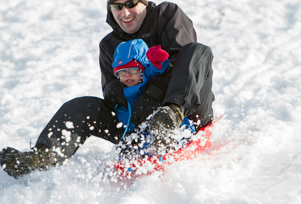 Eagerly sitting in front of the sled at the top of the hill, and almost pushing me out at the bottom to drag him back up.