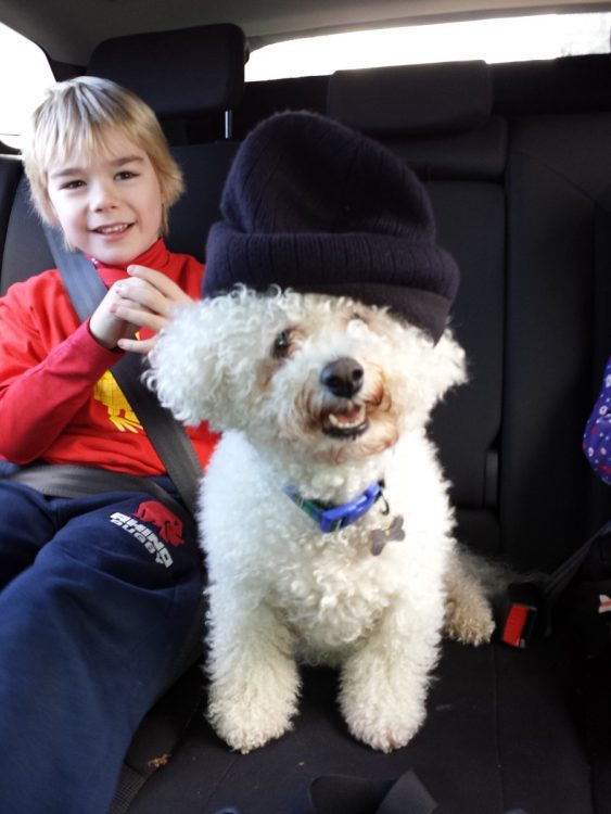 In the back seat of the car, the kids found something to amuse themselves today. Joey wearing their hats! He is such a chilled out family dog.