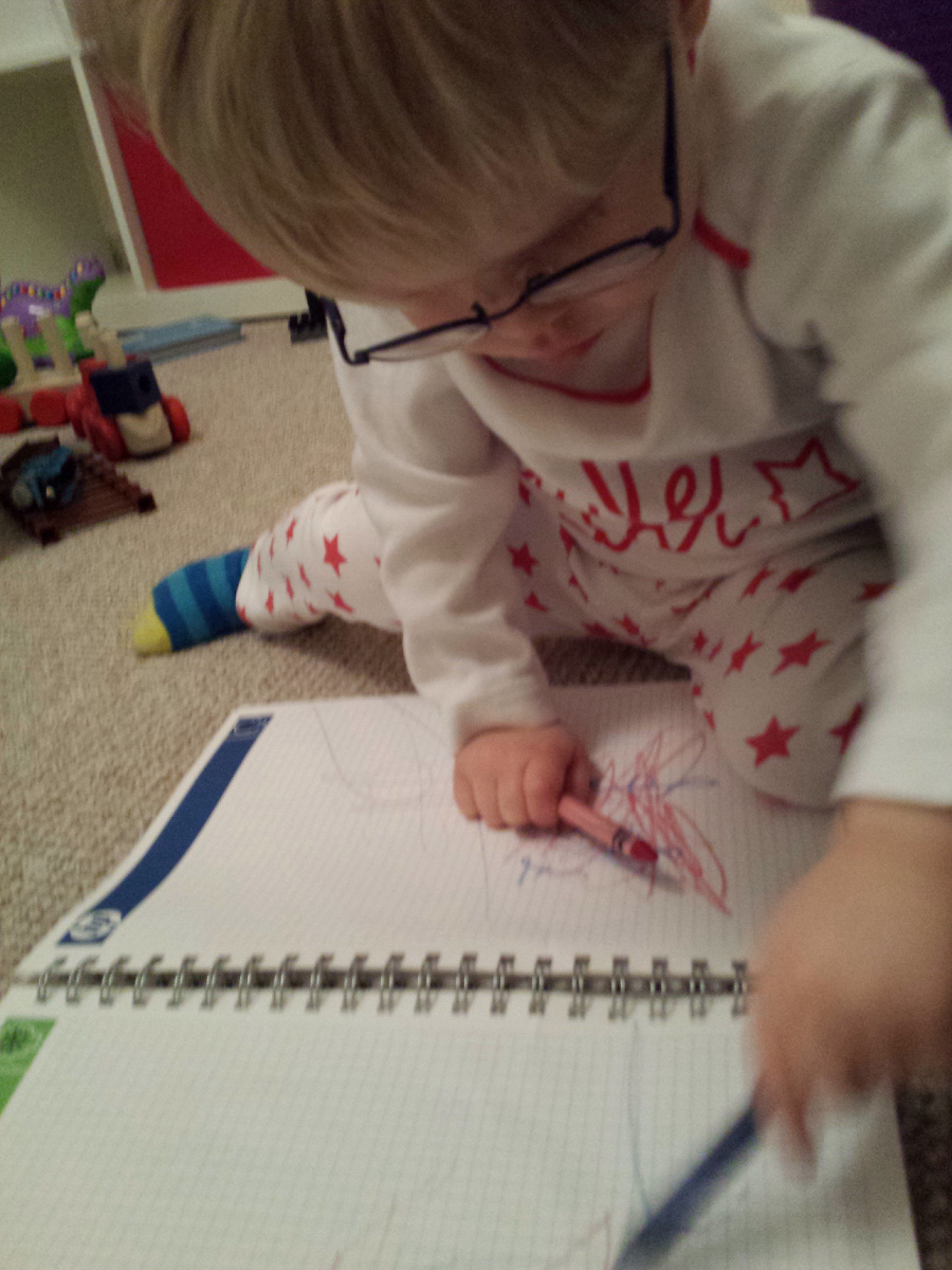 Since he has been wearing his glasses he has seemed a little more interested in drawing. Whether that is just a coincidence or whether the glasses have help I don’t know, but we will keep encouraging it while he’s interested!