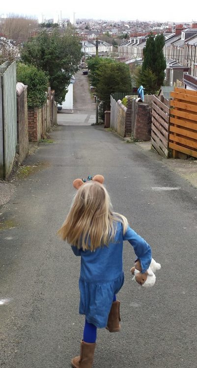 Soft toy in hand, fluffy headband ears on, skipping along, and singing to herself without a worry in the world.