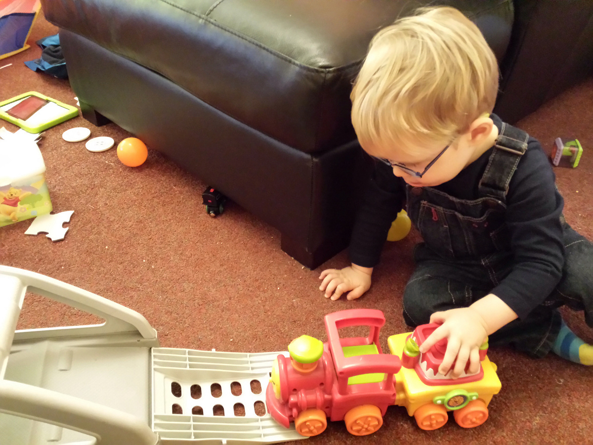 Today he was interested in combining his toys in ways he normally wouldn’t. One of his favourite combinations was getting his train to load itself into the car transport truck. He would line it up at the bottom of the ramp before hitting the go button. He would then giggle like crazy as the train headed up the ramp.