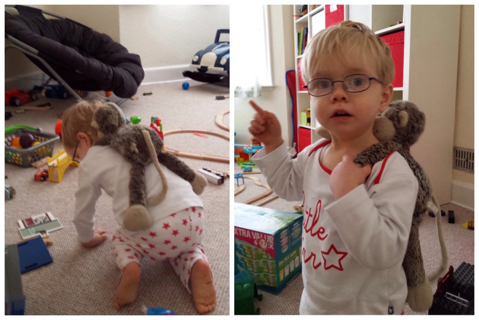 While nervously waiting for the lawyer to call back with an answer CJ kept me entertained with his attempts to play horsey, horsey with Puddle Monkey. Crawling was far to slow so he would get me to help him put Puddle on his back and then he would charge around the room – only stopping when Puddle fell off!