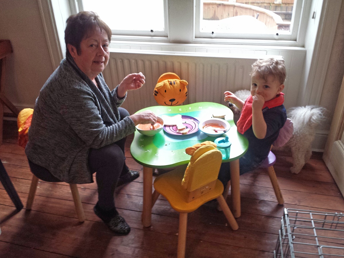 Adults sitting in kids chairs look funny, but M wouldn't have it any other way to eat his soup.