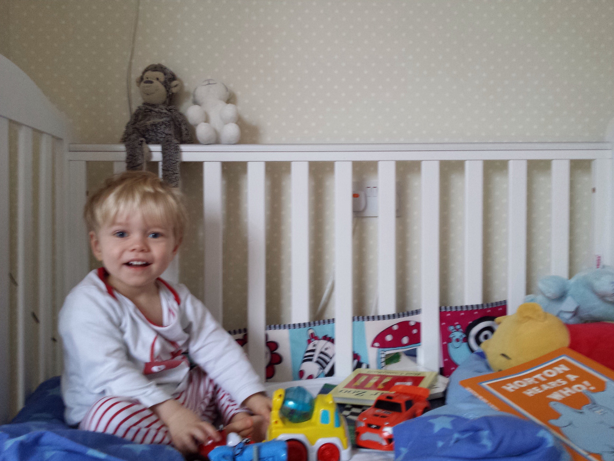 It’s great to see that he has worked out that he can get up when he wakes up and can play quietly until we go in and get him – although he always plays in bed with his toys while waiting for us.