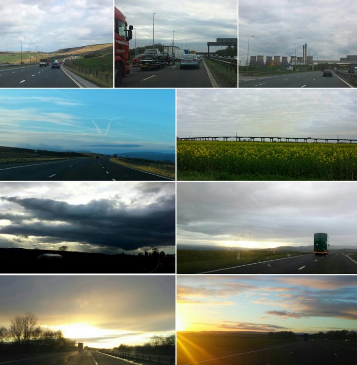 Beautiful blue morning sunshine, M6 gridlock, M62 snaking moorland roads, A1M industrial monsters, A63 flatlands covered in yellow, A66 confused weather over ever stretching views, and a fabulous and picturesque M74 sunset.