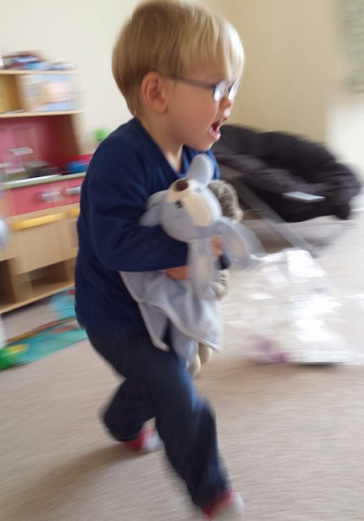 Today he hardly put them down and was running around the house with all three in his arms – giggling like crazy! When he got tired they all sat down for a snack and CJ would ensure that everyone had a bite of the snack and a sip of water?