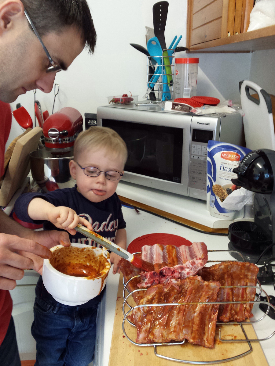 Although he was very keen to help with the activity today – painting marinade on the ribs before the are cooked on the BBQ! He was pretty good at it, getting most of it on the ribs but despite his best efforts we did end up with marinade everywhere!