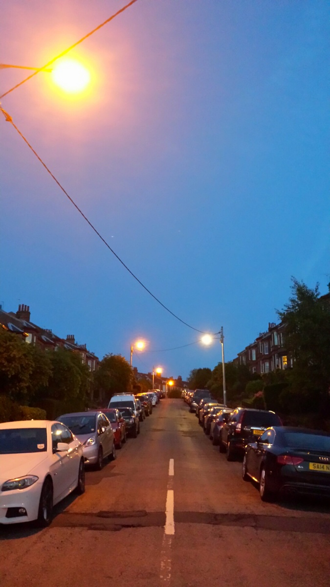 Out with the dog at 10.30pm in Glasgow. Clear skies, quiet roads, and a peaceful walk.