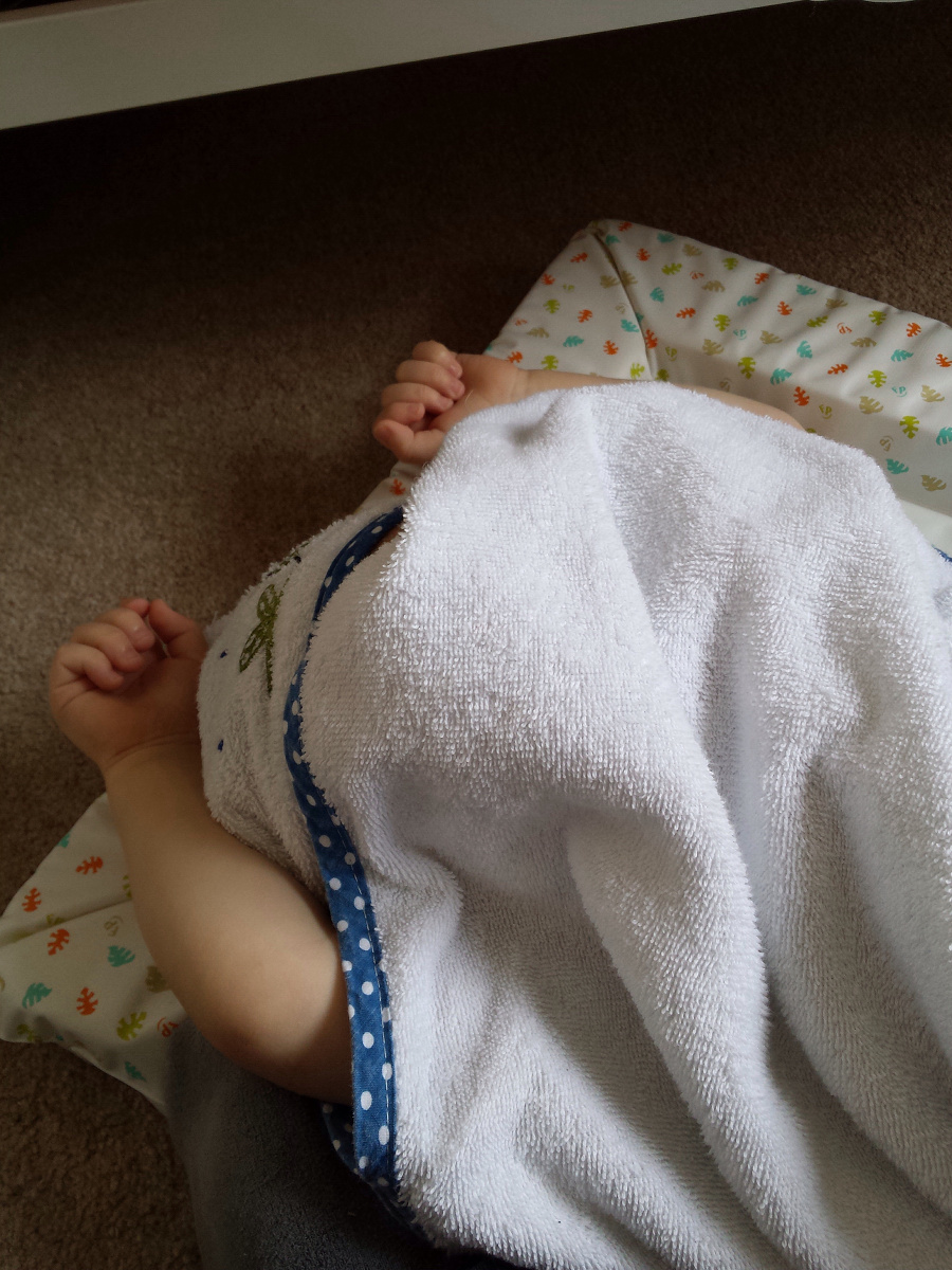 It was then straight home so S2 could have a shower to wash off the coffee – so CJ joined him briefly to wash off the chlorine. Despite being exhausted, getting dry is a perfect time for a game of hide and seek – although he did spend a lot of time hiding in the “crashed out” position! I’m pretty sure if he was having a little cat-nap!