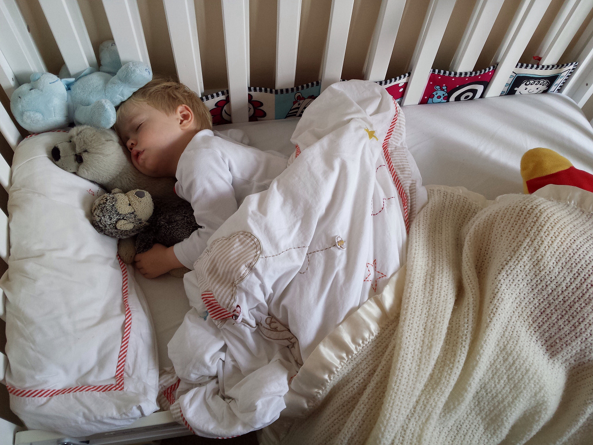 Poor CJ had been rather active during the night. The duvet had been tucked in and the toys were on different sides of the bed and the blanket was over him.
