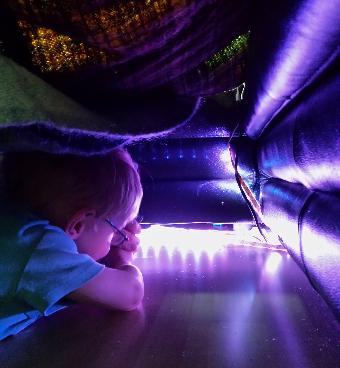 We built a tunnel with the couch and rugs.