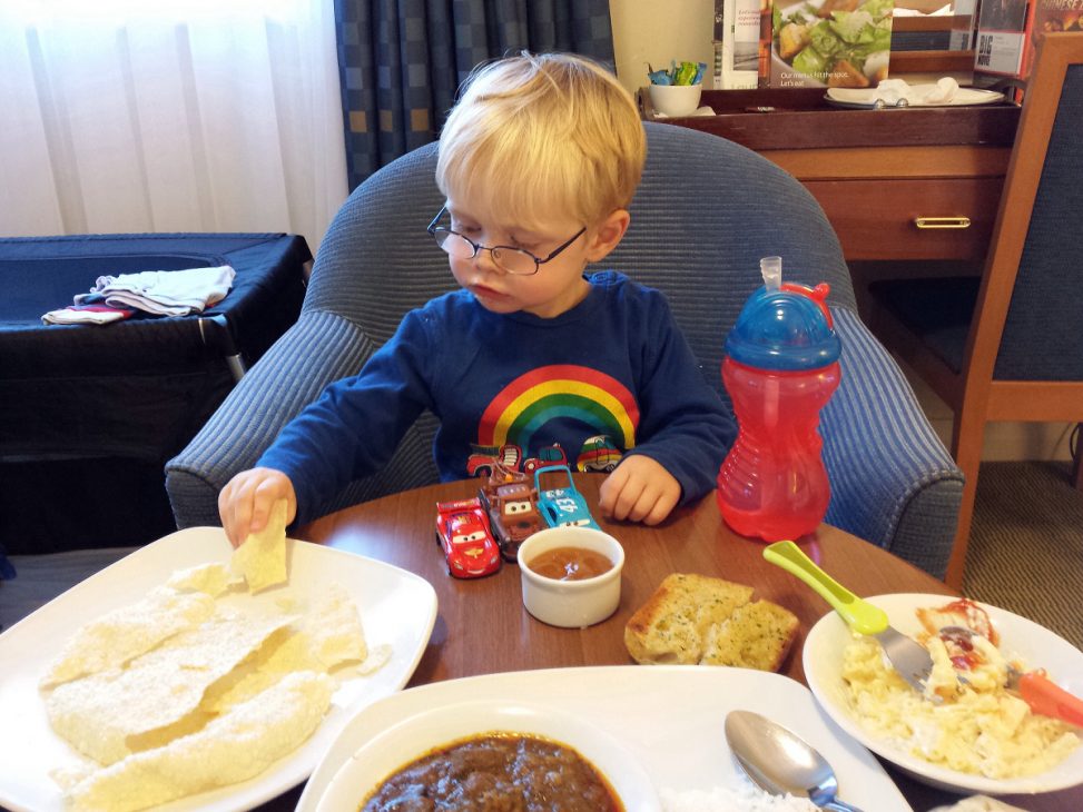 After swimming, we headed back up to the room to order some dinner and set up the travel cot. It wasn’t long before dinner arrived and CJ thought it was a great game to share a small table with me and his car toys.