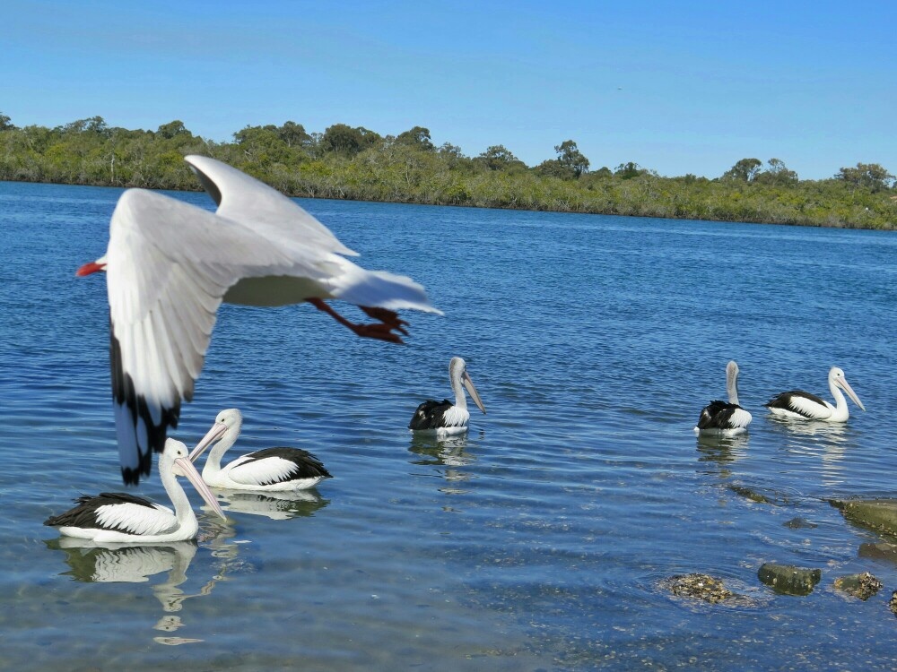 Pelicans at the river …….. and a seagull who took me by surprise when it whizzed past my camera 🙂