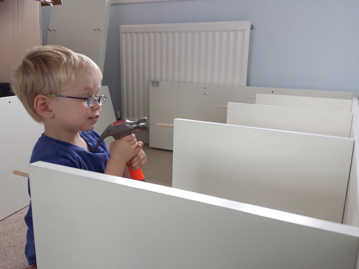 Although once the assembly started upstairs, CJ wouldn’t leave the room as he had a very important job – he had to put all the doweling back in. And he took his job very seriously, making sure every piece was gently tapped in with the hammer!