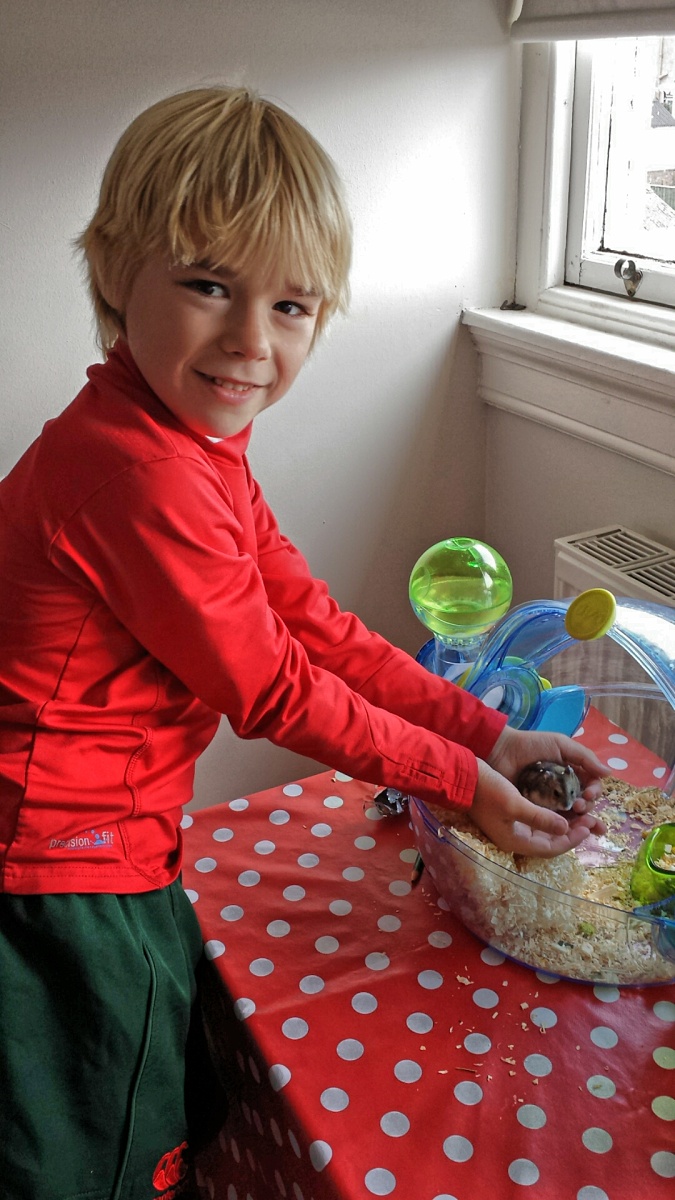 Poppy is getting used to being with people. It's only 3 days since she joined the family and she is ok being picked up and patted. Only a few days more, and she will be running around in her hamster ball 🙂