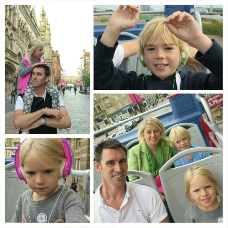 An open top bus tour of Glasgow – interesting for the adults and fun for the kids with their brightly colored earphones.