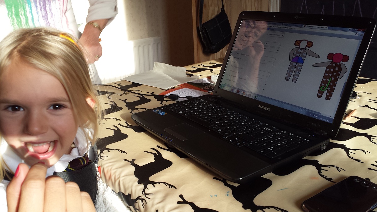 A great idea for a business, where you can choose material for your own onesie, then add a hood, pockets, tail, ears, etc. I designed a pretty crazy Onesie using a voucher gift from her birthday, but as you can see she was very proud of it.