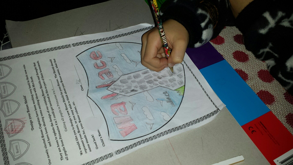 R is definitely more artistic than his parents. The school has everyone grouped into houses, and todays homework is to design a shield for it. His own design and drawing, done with care and attention. Very proud Dad 🙂