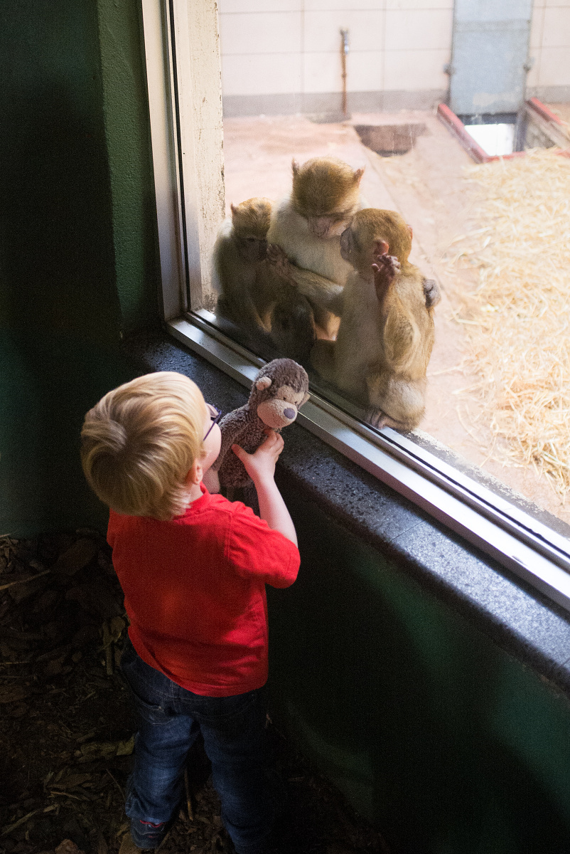 On one side of the glass, the monkeys huddled around for a look. On the other side of the glass, all the people visiting the monkeys were huddled around taking photos of CJ and Puddle being unbelievably cute.