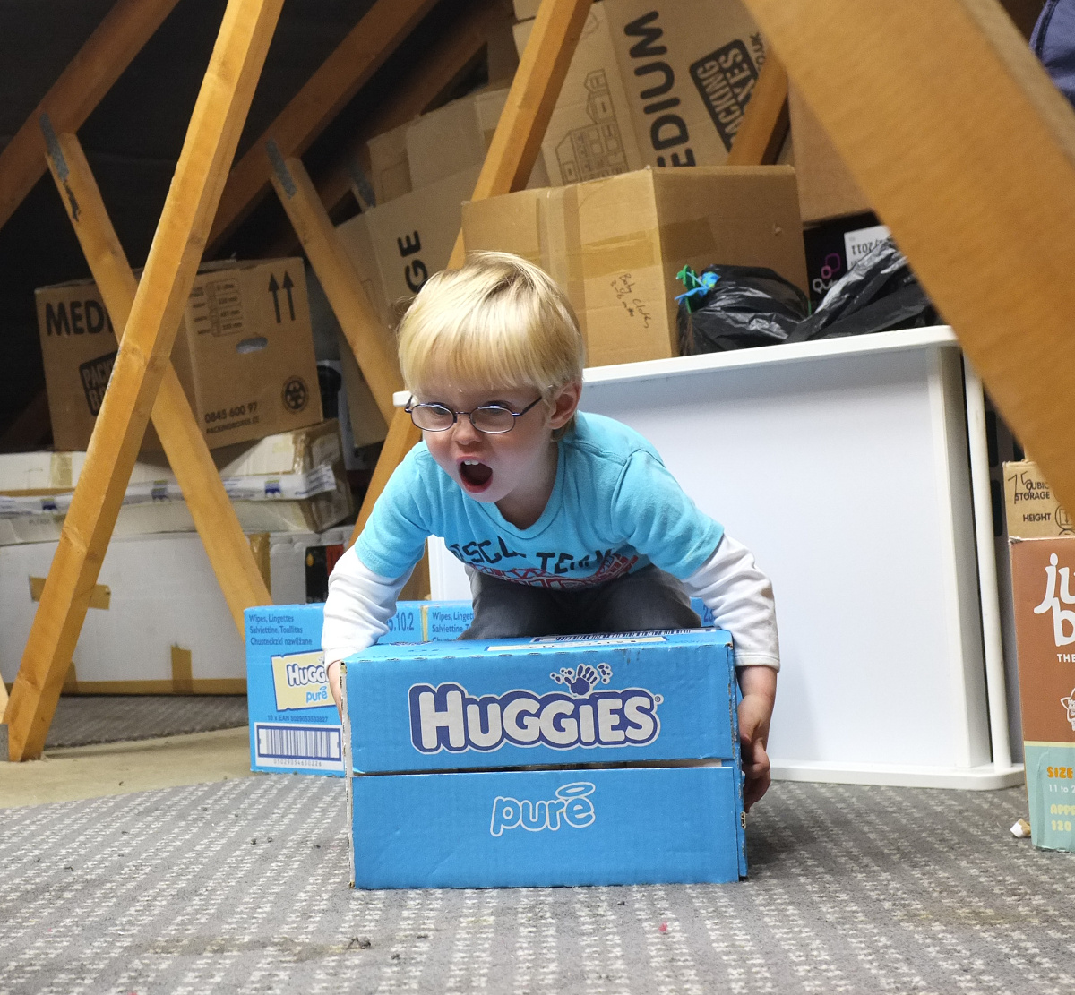He loves the attic. The baby wipe boxes were probably a bit heavy for him, but that didn’t stop him from getting them to the loft hatch and dropping them down to me.