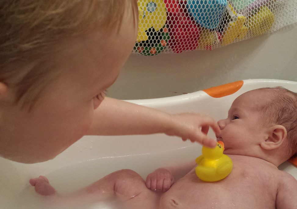 He loves bath time (even more than CJ did). We are yet to have a single cry even when I tip water on his head.