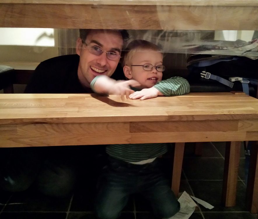 We don’t know why, but he suddenly decided that he wanted to hide under the table and he dragged S2 there as well. When I entered that kitchen there were lots of giggles and he kept peeking over the bench.