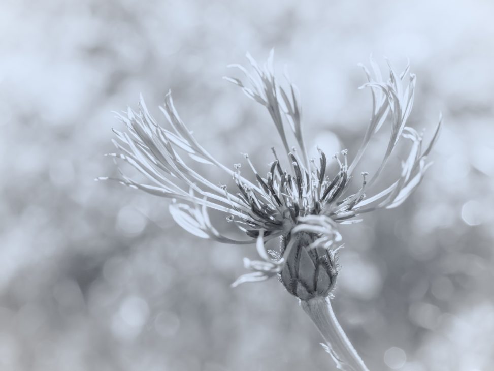 It rushes through the forest and sounds a bit like the roar of an earthquake, and she probably feels the vibrations as well, so she gets a bit tense. Because I don’t go into the forest in the big winds we only had a short walk this morning (on our way to get the newspaper) and spotted this flower beside the river. It is actually a very bright purple flower but I like it in b&w today 🙂