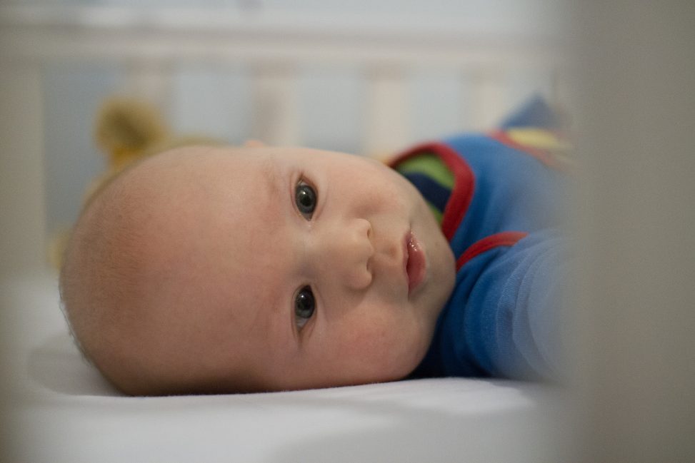 His bright eyes seemed fascinated by the mobile over his cot.