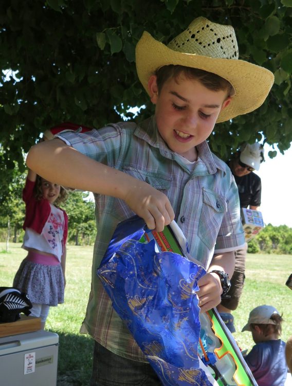 Lunch at Halswell Quarry today with my brother’s family. It was a very warm day and we found a sheltered spot for a scrummy shared picnic ……. but first was a game of cricket, then parcel opening for the kids. J looks delighted with his new archery set