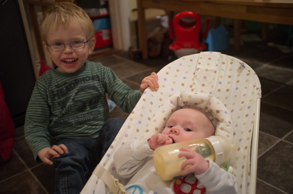 CJ took LJ’s bottle off the bench, carried it over, helped him hold it, kissed him softly and sat beside him smiling proudly as LJ stopped crying.
