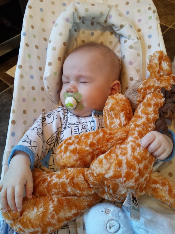 LJ is starting to interact with toys, so we have started making sure Wellington the Giraffe is always nearby.