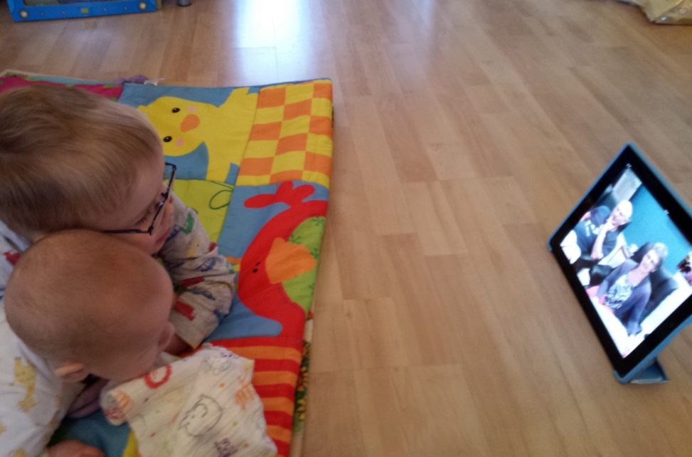 Now that LJ is starting to be a lot more alert and active, we tried to include him more in the call this week. The outcome – both LJ and CJ laying on the mat together, “chatting” away to their grandparents.