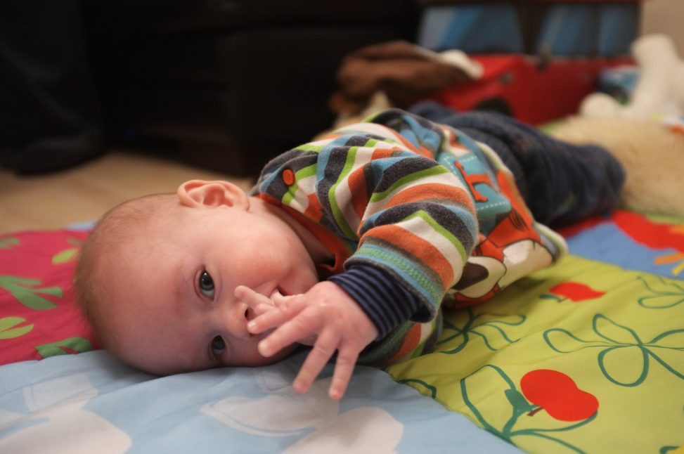 We have only really started doing a lot of tummy time recently now that he has finally got over all his bugs and colds. He has been close to rolling a couple of times, but tonight he was determined and he had an audience – with S2 even managing to capture the [url=http://vimeo.com/117599571] first roll on video.[/url]