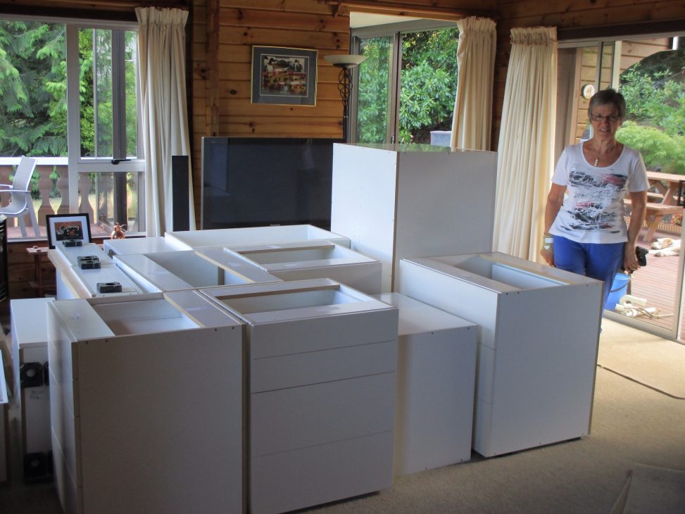 Today our builder/joiner and I took out the old kitchen at the bach and we shipped in the new one (in lots of manageable pieces) that he had built in his workshop.