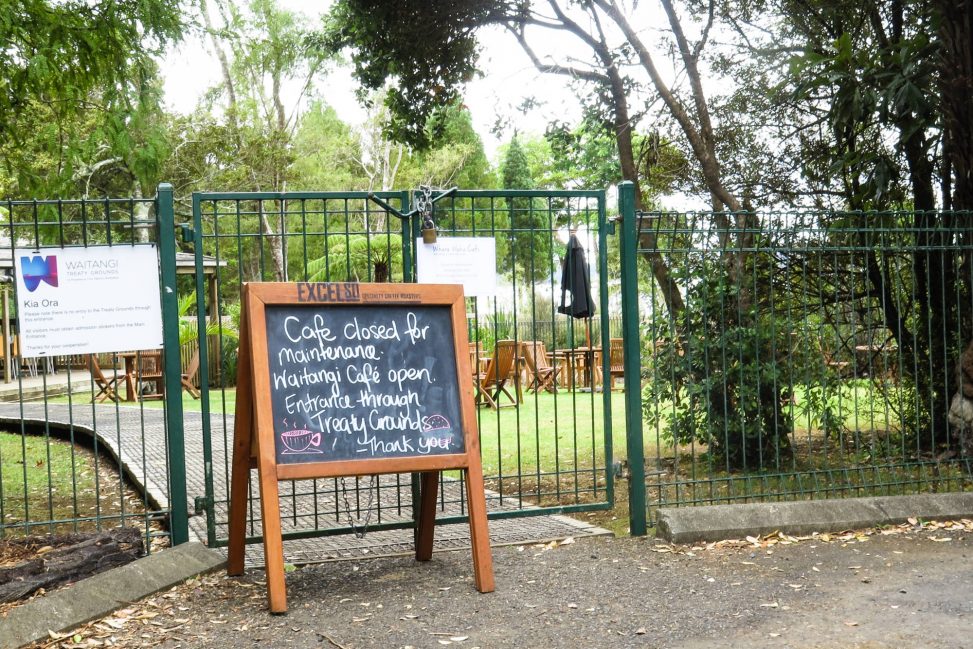 Biked around the waterfront to Waitangi this morning to have coffee at our favourite cafe where the tuis sing, the bellbirds twitter and the pukeko strut around the yard ….. but our plan was foiled!!