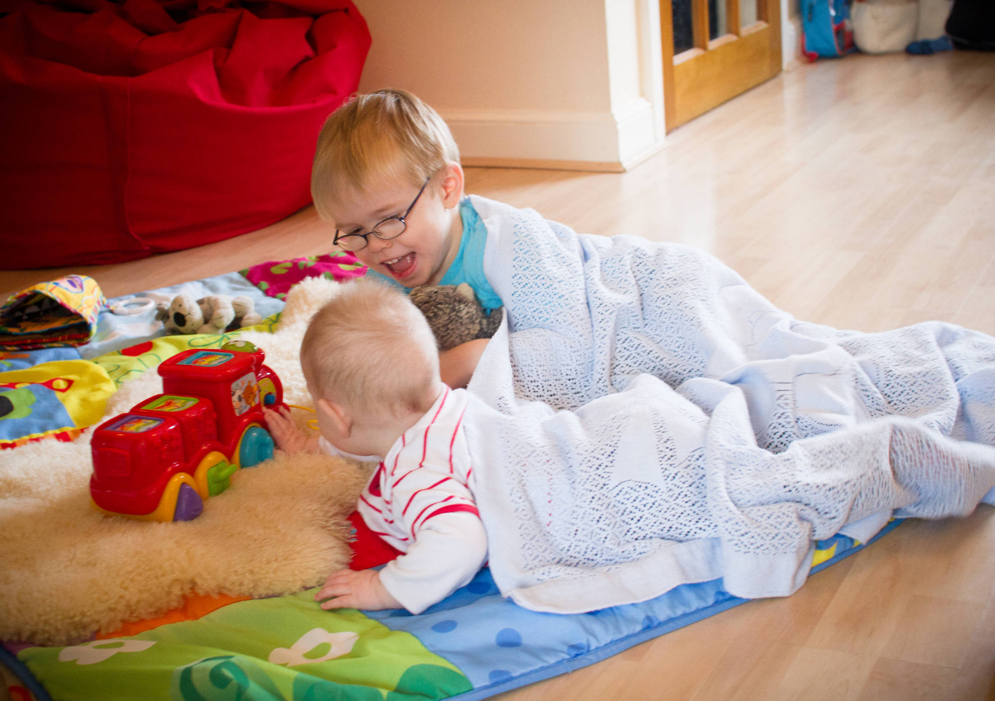 Today I stood watching the two of them cuddling under a rug on the lounge floor, CJ showing LJ how to use his toys. My heart melted like butter.
