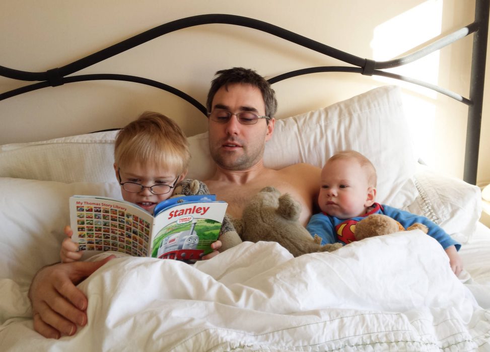My arms around the two boys as CJ patiently turns each page for me to read to them.