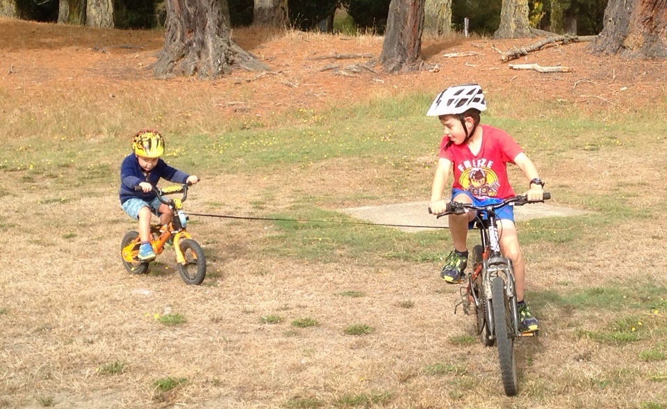 Simple, just attach his bike to hers with an expandable dog lead, so he can’t ride away!