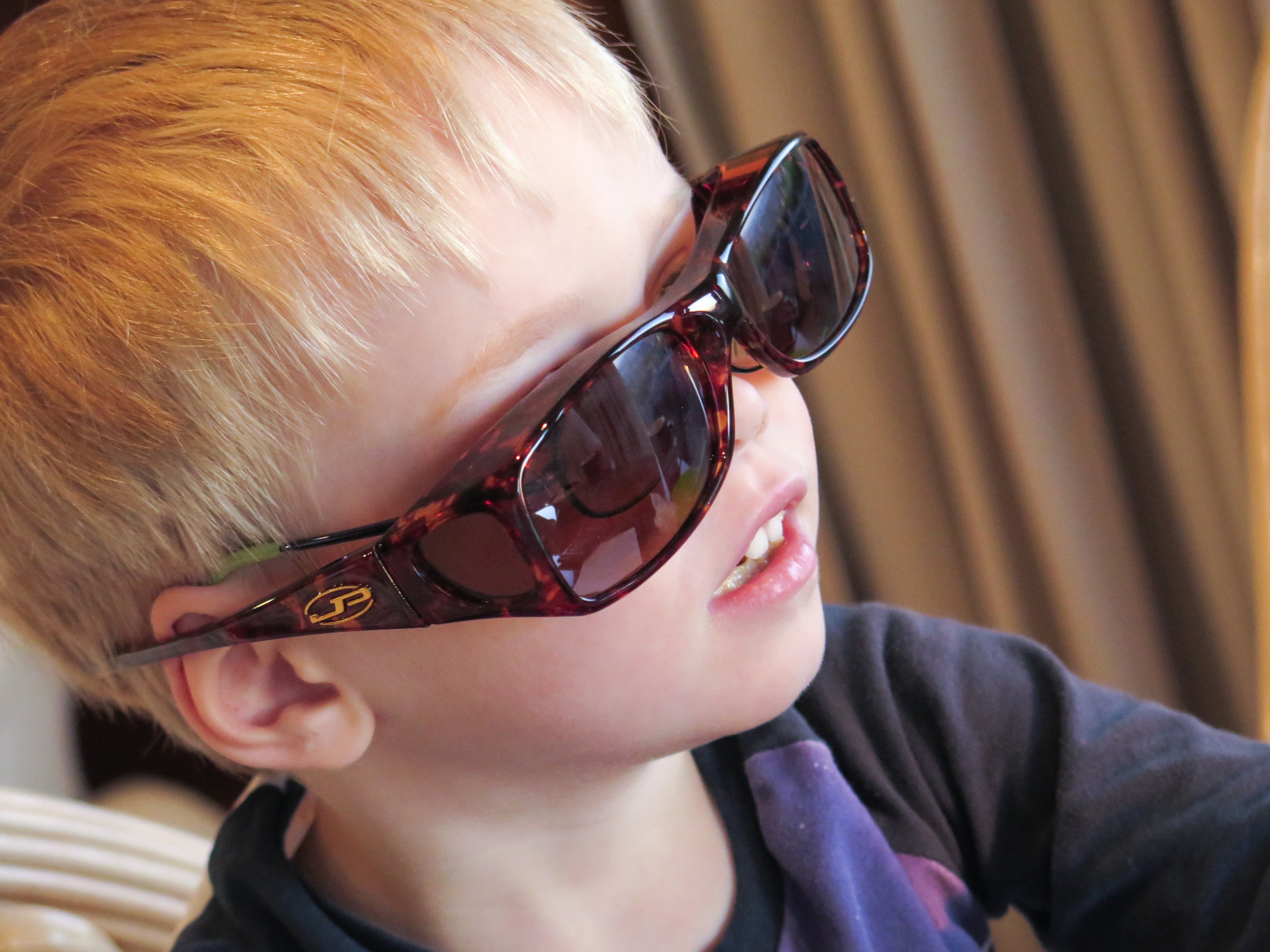 CJ is finding the NZ sun too bright because he is very long sighted and his glasses are like a couple of magnifying glasses ………… so today he tried out my fitover sunglasses which certainly helped him see, but keeping them on his wee nose will be a bit of a challenge.