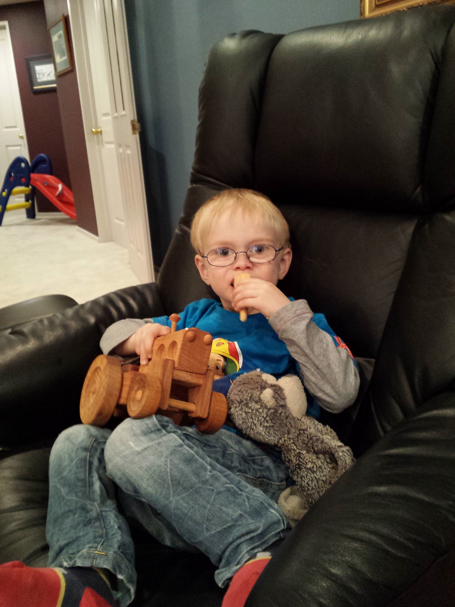 And of course if he was watching a tractor on TV, he had to have a toy one to cuddle.