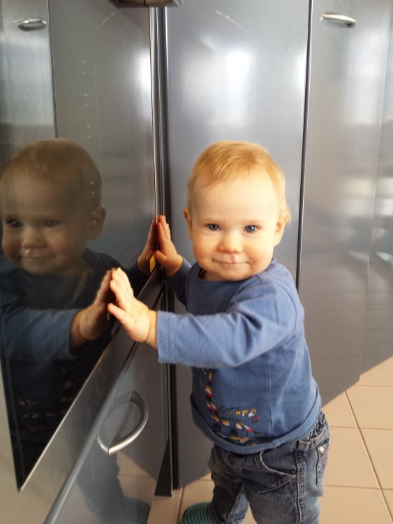 LJ is still fascinated with his reflection. His current “new friend” appears to live in the oven and LJ loves to stop and visit him as he crawls through the kitchen.