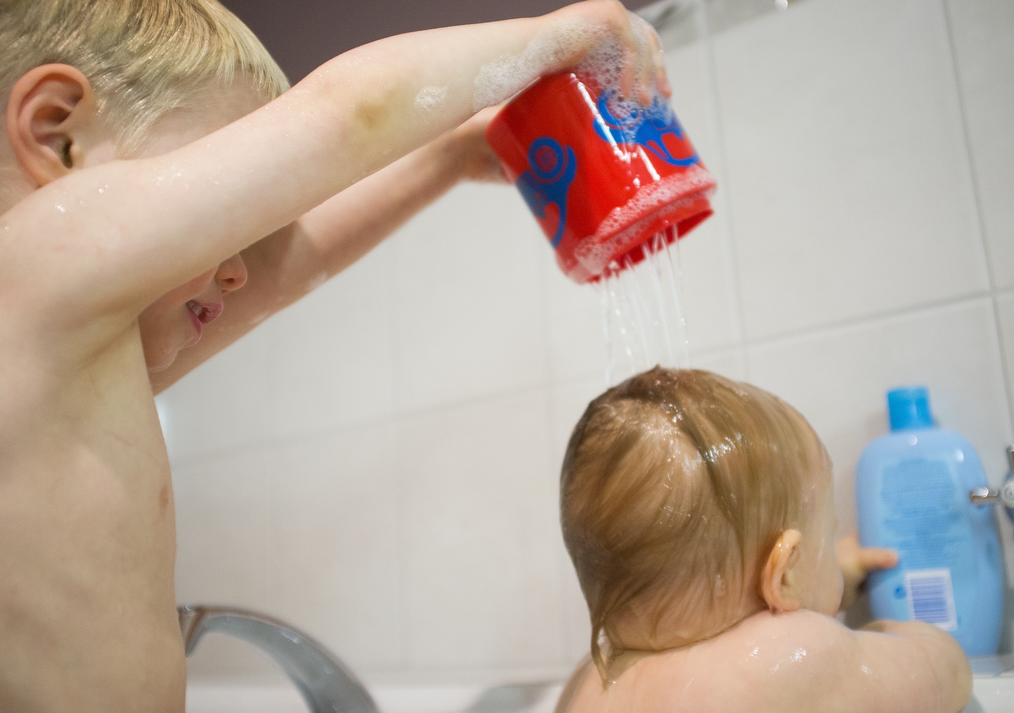 And when it comes to washing time, CJ is always trying to help, by rinsing the bubble off LJ.
